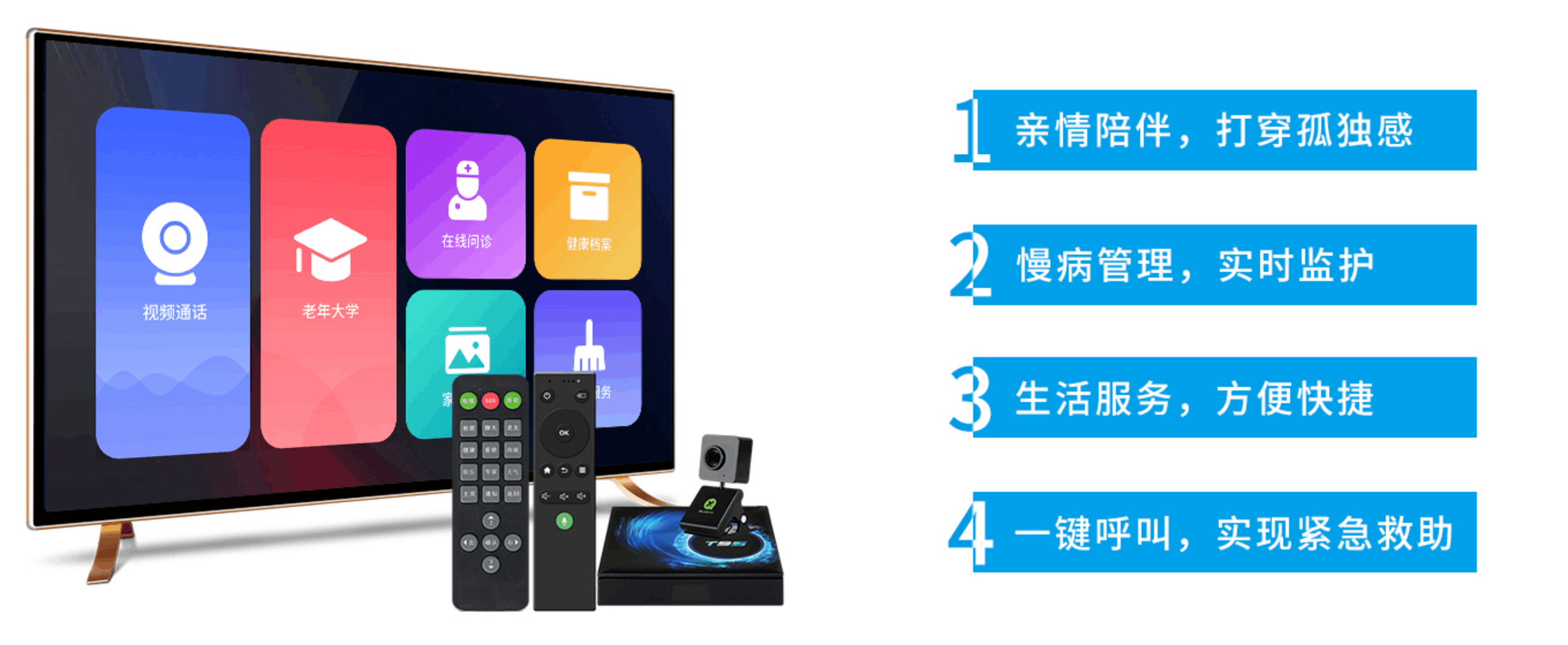 親情陪伴:老人可以通過遙控器與子女進(jìn)行視頻溝通,增加情感交流,促進(jìn)親情陪伴