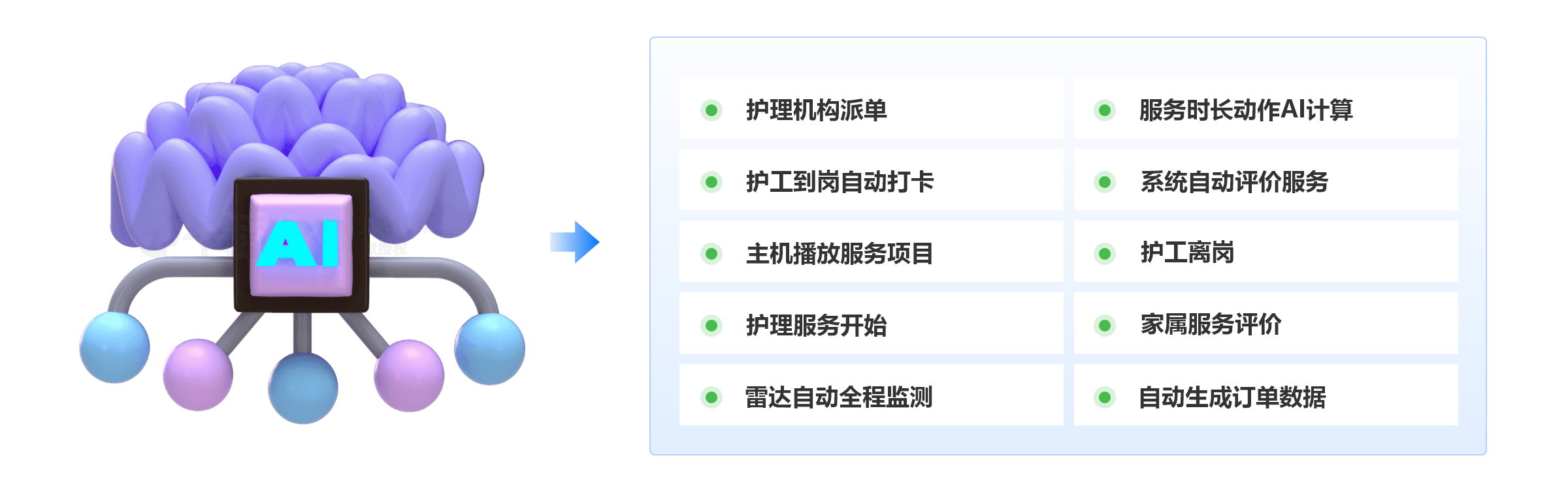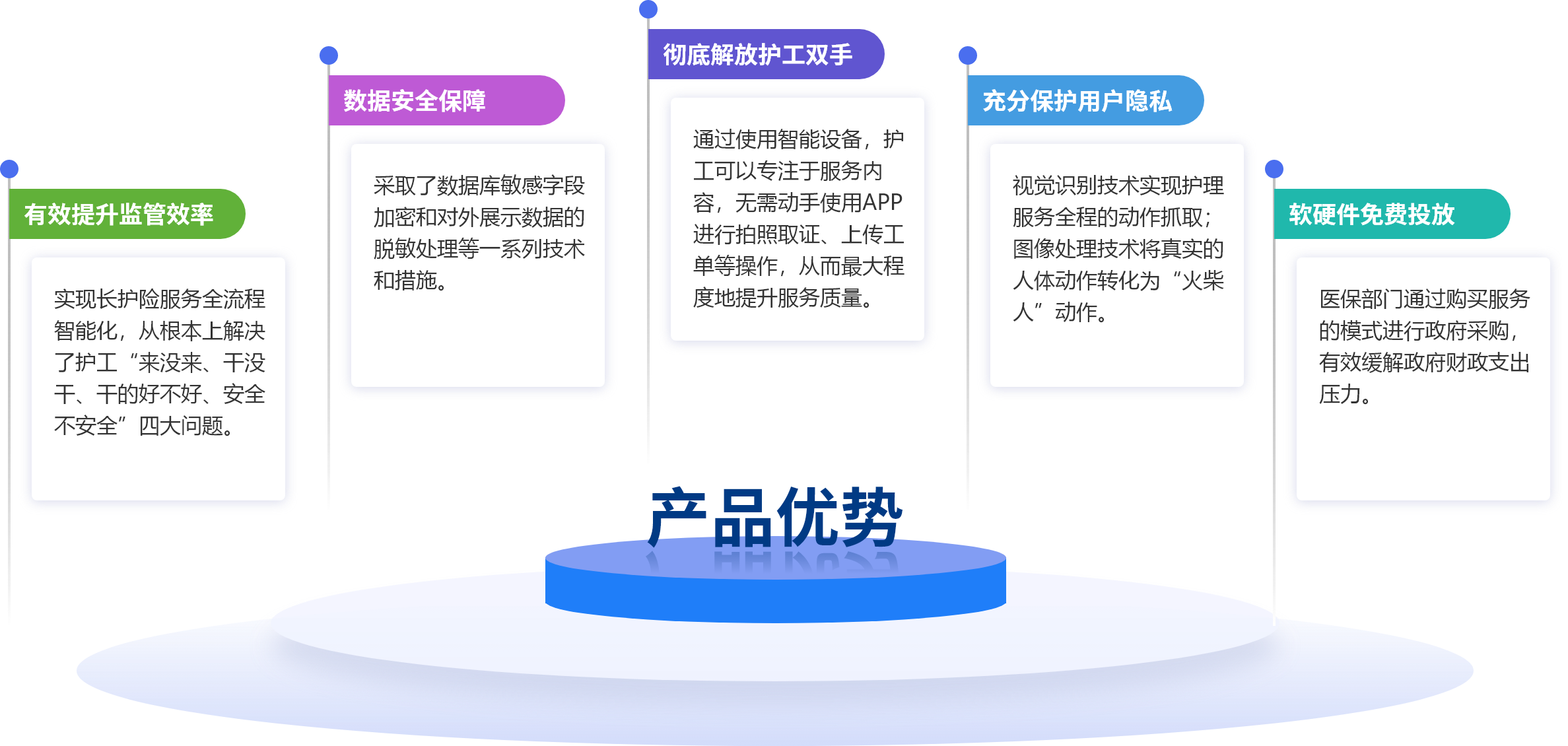 運用先進的人工智能AI視覺識別、圖像處理、無線通訊和定位、云端大數據運算和傳輸等技術,首創高效安全的長護險服務設備和監管系統。