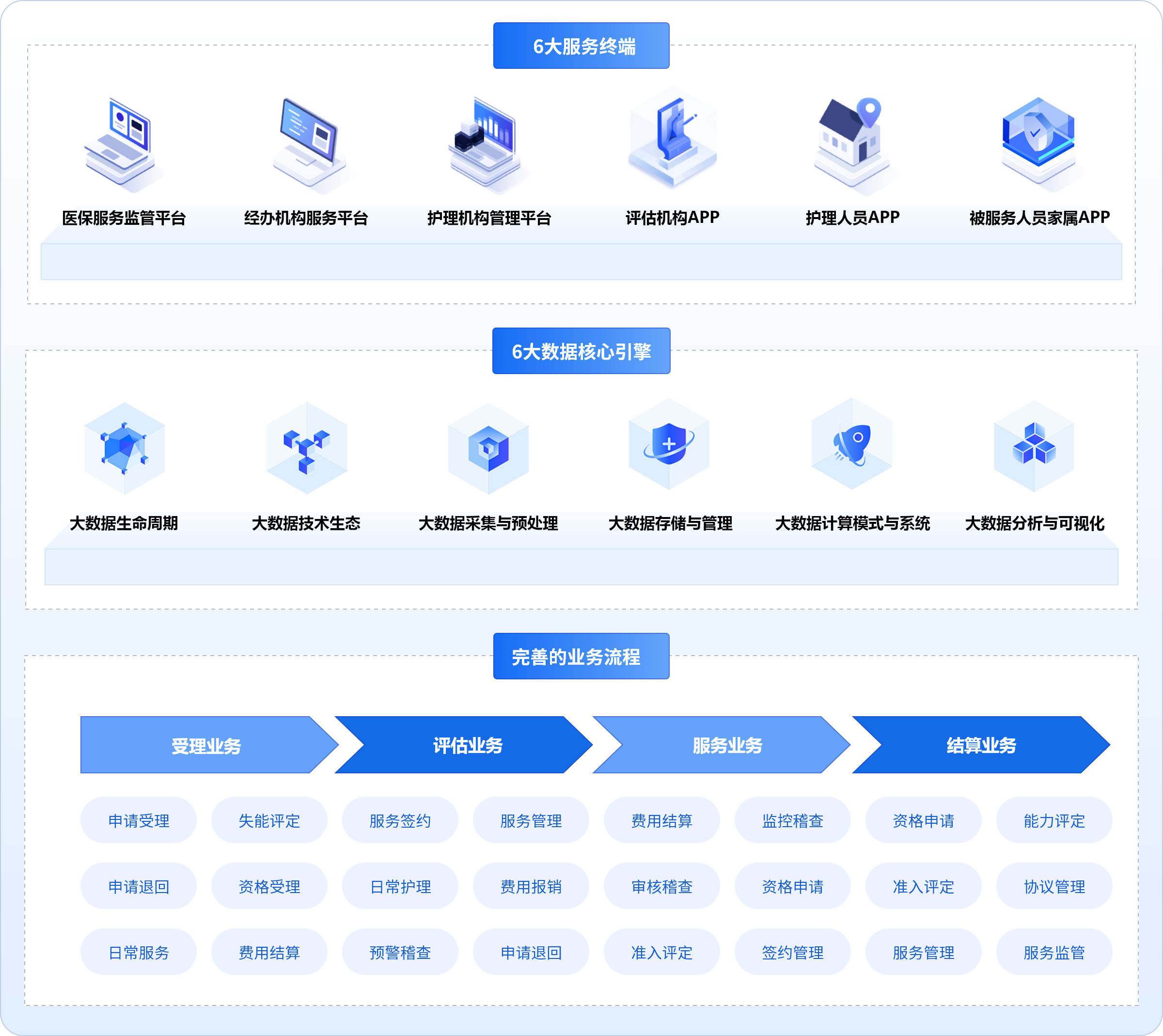該系統是集長護險參保人員、評估機構、護理機構、承辦機構、醫保部門的需求為一體的全方位、多層次、立體化的智能化綜合性監管系統。