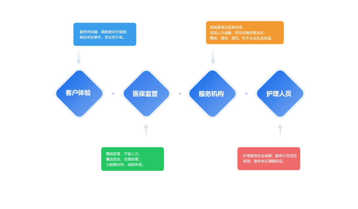 護理服務公司、護理人員及被服務對象等無法實現互聯互通,導致無法完成服務需求推送、服務事項安排、服務時間審定、服務過程監管、服務質量評價等工作。為了提高運營效率,迫切需要智能化工具來改善這一狀況。